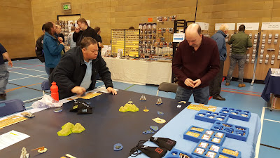 As usual I was helping out with the "Wings of Glory Aerodrome" participation game, which also had an added "Sails of Glory" table. As is often the case a slow start, but once us gamesrunners start to play the punters come out of the woodwork and we played several very active games of each. Good fun as usual.